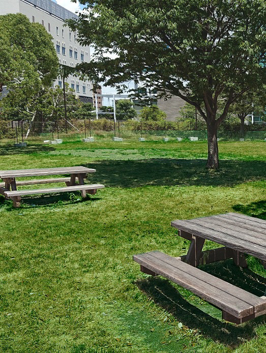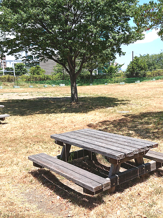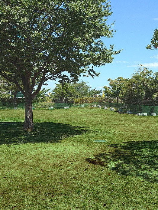 緑がたっぷりのエリアで、愛犬と自由に走り回れます! ベンチもあります。